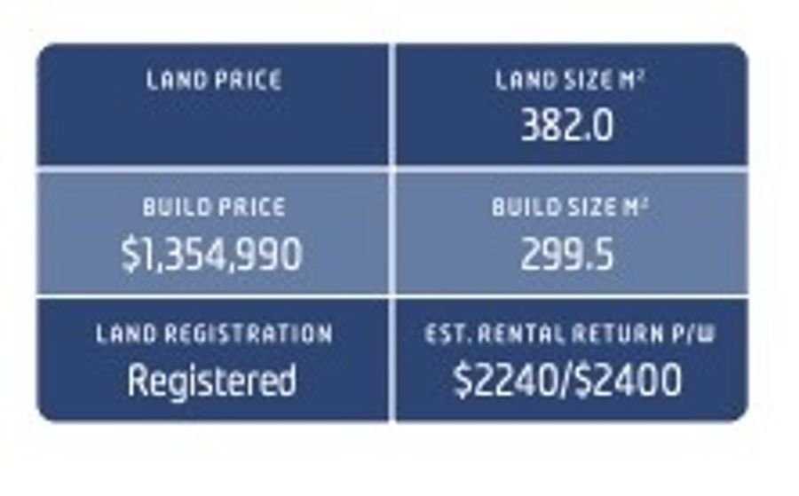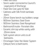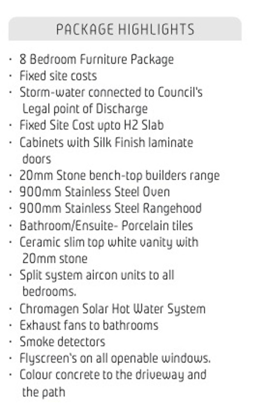 Up to H2 slab/ silk finish laminate doors on cabinets/ 900mm stainless steel oven, cook top and range hood/split system air cons to all bedrooms/smoke detectors/8 bedroom furniture package/stormwater connected to council’s/20mm stone benchtops in bathrooms and kitchen/porcelain tiles in bathroom and ensuite/Solar Hot Water system/flyscreens/ coloured concrete to the driveways and pathways